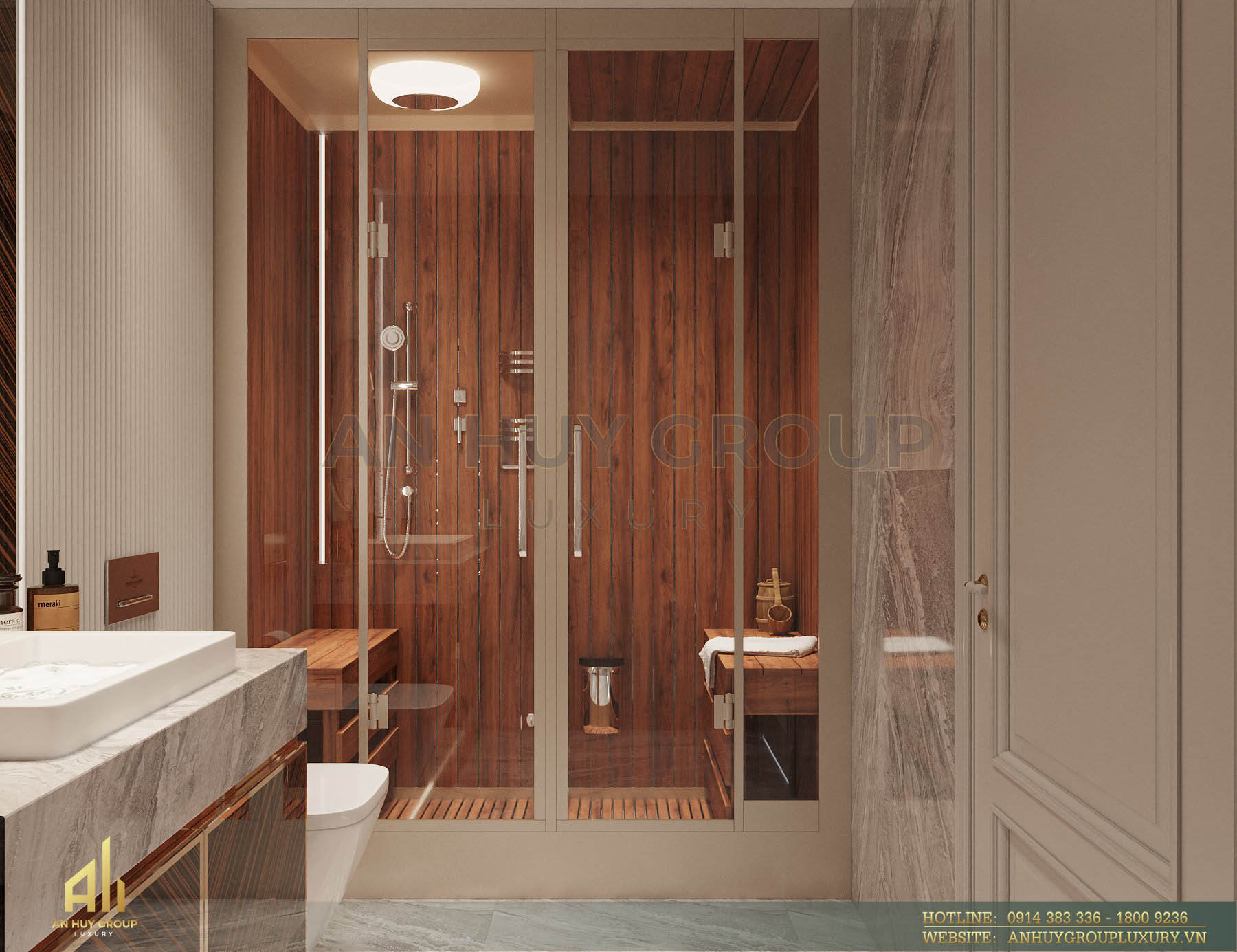 Đặc biệt không thể không kể đến, phòng xông hơi được tích hợp trong nhà vệ sinh 1, đem đến không gian thư giãn tuyệt vời cho gia chủ sau một ngày làm việc mệt mỏi. Hệ thống điều khiển nhiệt độ và độ ẩm thông minh, đảm bảo an toàn và tiện lợi cho người dùng.
