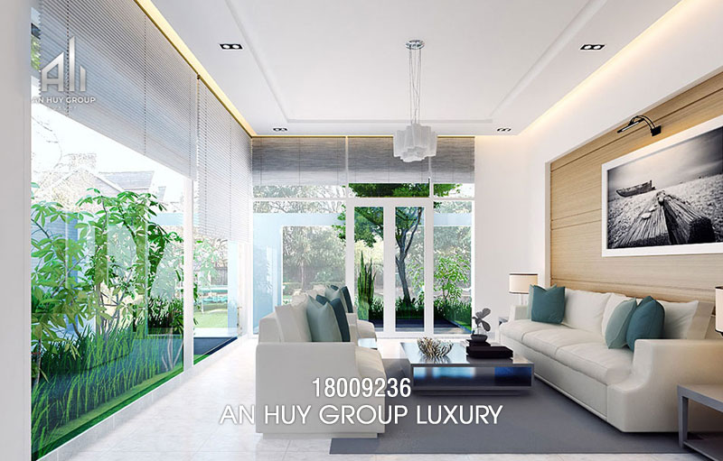 Phòng khách tràn ngập ánh sáng, màu sắc xanh mát của cây với hai mặt đều là cửa kính trong suốt. Tất nhiên không thể thiếu được những chiếc rèm cửa chắn sáng để gia đình có thể tự do điều chỉnh cho phù hợp. Tông màu trắng chủ đạo càng tăng thêm nguồn sáng cho căn phòng. Đây cũng là màu sắc có tác dụng mở rộng diện tích hiệu quả so với diện tích thực tế.
